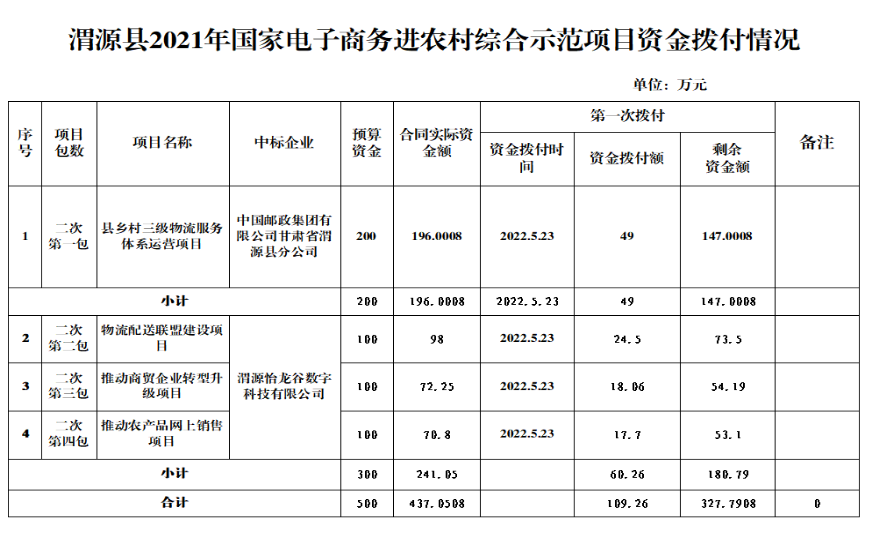 渭源县商务局实施的渭源县2021年国家电子商务进农村综合示范项目二次招标完成后,于2022年4月18日与各包段项目承建企业签订采购合同,按照合同约定,为各分包中标企业按照项目合同价款的25%预付资金,现将具体拨付情况公告如下: