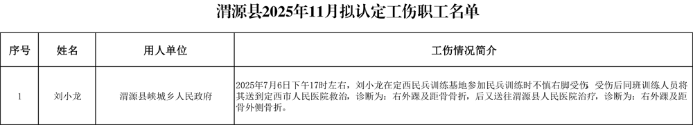 根据《工伤保险条例》有关规定,经审查材料和调查核实,现将渭源县2025年11月拟认定工伤职工名单(共1人)予以公示,公示期限7天(2025年12月1日--2025年12月7日),欢迎社会各界监督。如发现影响工伤认定的问题,可通过电话、来信、面谈等形式反映,我们将认真进行受理,并向署名或当面反映问题的人民群众反馈调查核实结果。如不存在影响工伤认定的问题,将按有关规定认定。