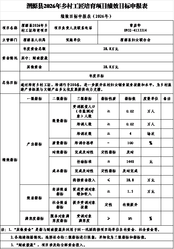 附件:渭源县2026年乡村工匠培育项目绩效目标申报表