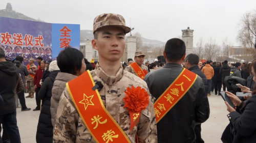 新兵代表刘博说:“今天我怀着无比激动的心情来参加欢送仪式。身着戎装,胸戴红花,这是我无悔的青春选择。踏入军营,我定当刻苦训练,百炼成钢,用热血和汗水守卫祖国安宁,为祖国增光添彩。”